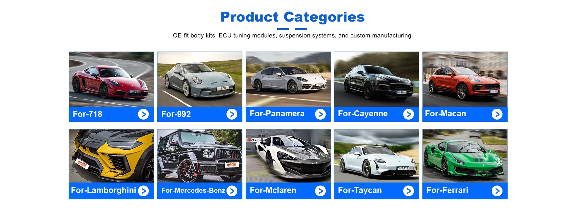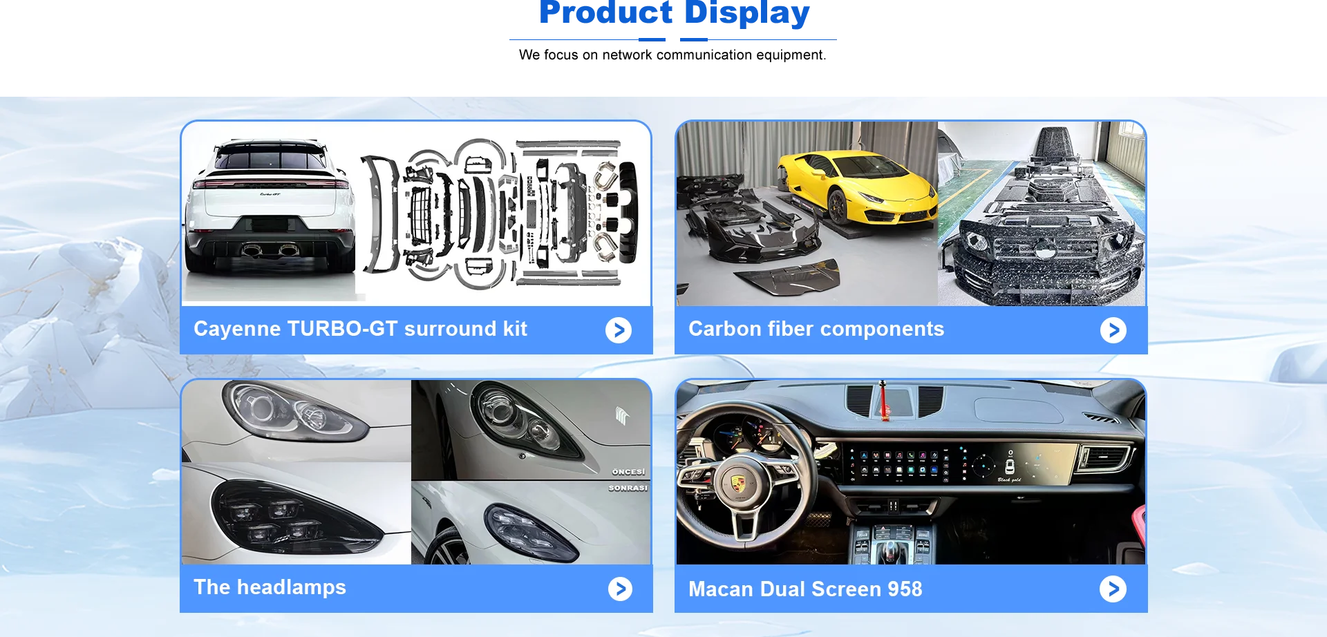 Productos principales:Revestimiento de fibra de carbono, faros de automóviles, piezas de revestimiento de automóviles, kit de carrocería, componentes electrónicos automotrices